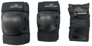В комплект входят наколенники и налокотники, которые обеспечивают защиту и предотвращают травмы локтей и коленей при падениях. Защита запястий оснащена жесткими пластинами на тыльной стороне, которые предотвращают выгибание кисти назад и защищают запястье от вывихов.