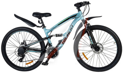 Бюджетный двухподвесочный горный велосипед на 26-дюймовых колесах HILAND для поездок по самым разнообразным дорогам. Алюминиевая рама, амортизационная вилка, 21-скоростная трансмиссия, дисковые тормоза, двойные алюминиевые обода.
